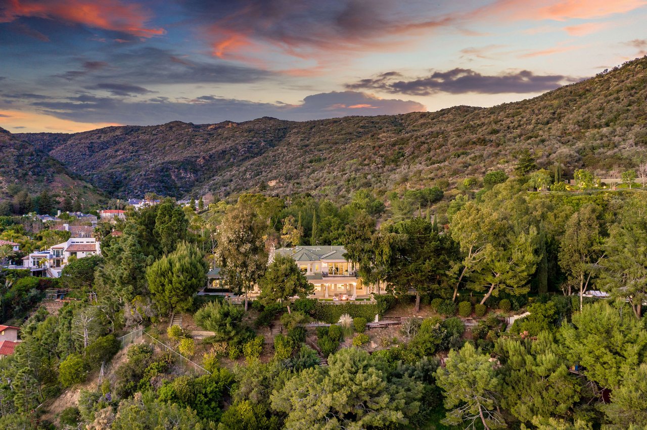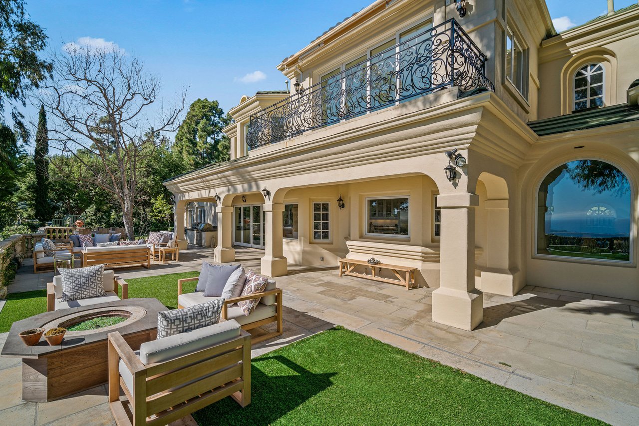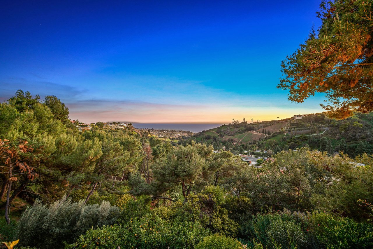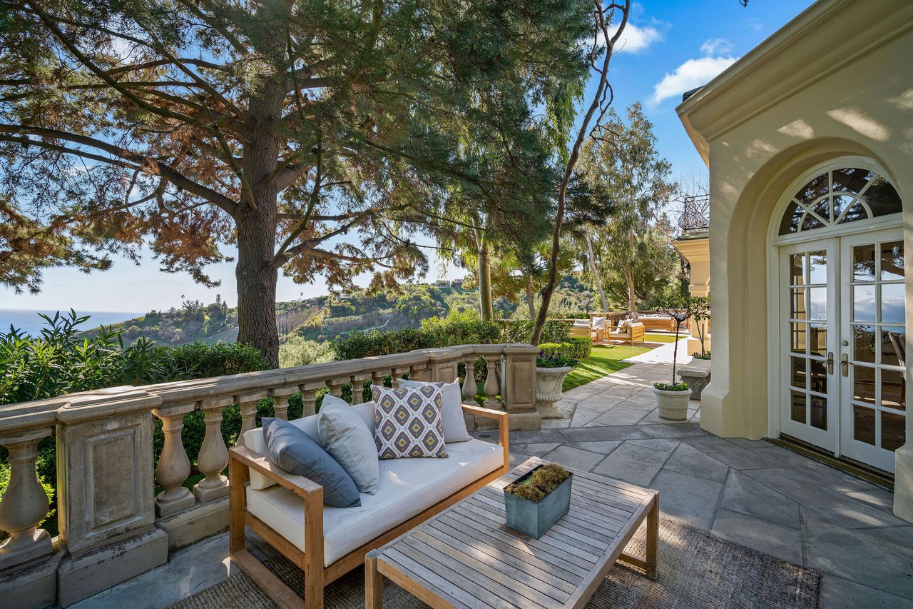 Magnificent Mediterranean 6 bed, 6 bath villa in the prestigious gated Ridgeview Country Estates. Sweeping unobstructed views of the ocean, vineyards, and lush landscaping with citrus trees and terraced gardens surround this beautiful property. Approximately 1.2 acres of flat expansive lawns with a modern pool and grand pergola as well as children's play area. Upon entering, natural light flows and a stunning view of the ocean welcomes you. This gated estate features a gourmet Chef's kitchen that opens into a family room and outdoor living area creating that ideal indoor/outdoor California living. Upstairs, the exquisite master suite has a secluded balcony with breathtaking ocean views. Additionally, a private screening room & outdoor barbecues are built to captivate & entertain. Moments to Palisades Village, this home is a true retreat. A rare offering, not to be missed.